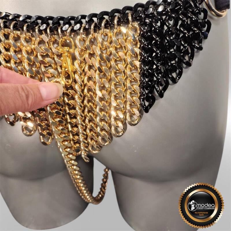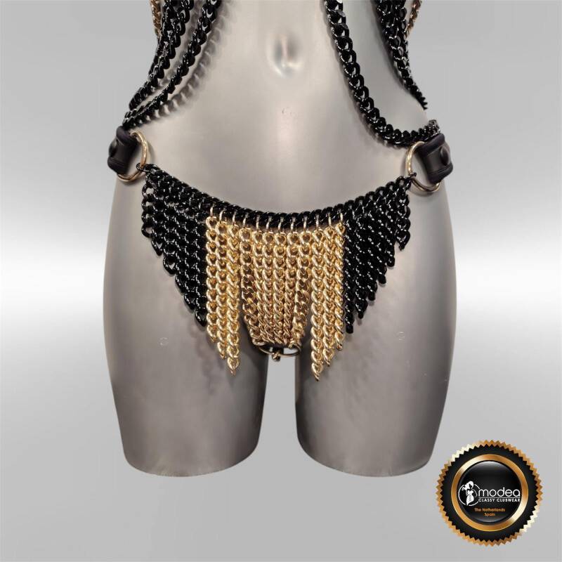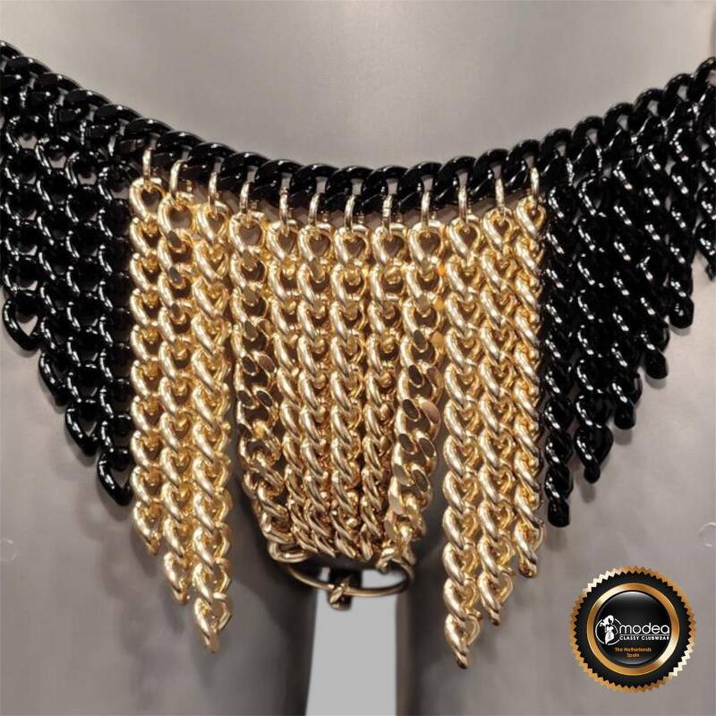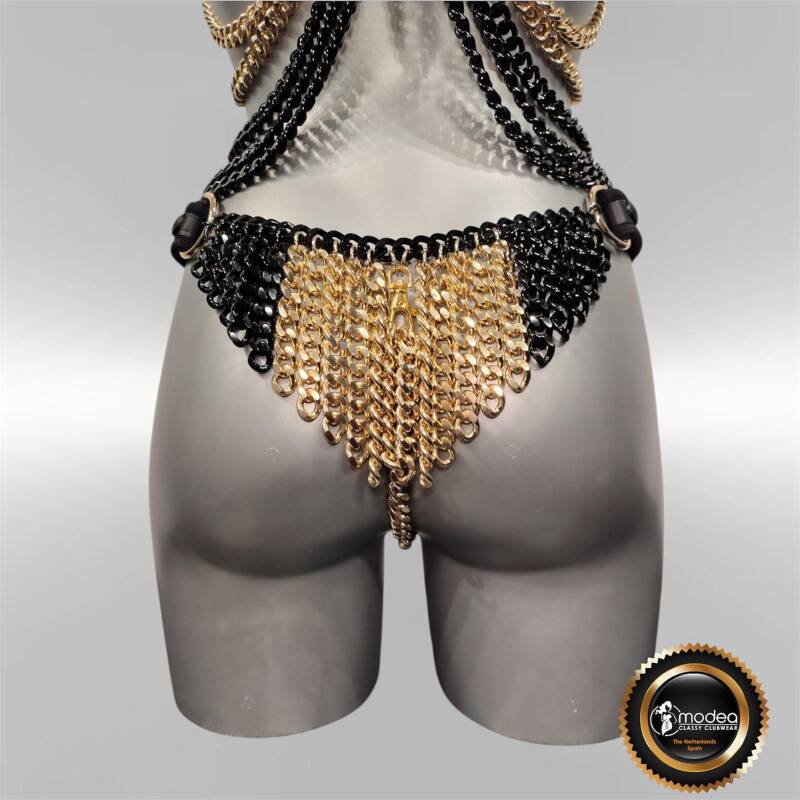 De stijlvolle Celeste-set bestaat uit een bi-color top gecombineerd met een bijpassende bi-color rokje. Het rokje kan ook als string gedragen worden...en zelfs als indrukwekkende halsketting.